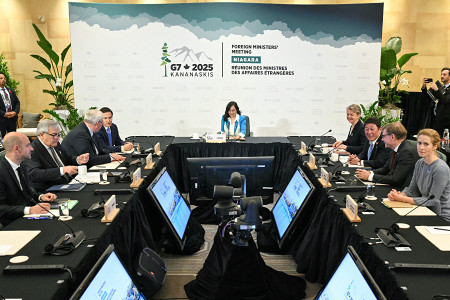 カナダ東部オンタリオ州ナイアガラ地方で2日間の日程で開かれていた先進7カ国(G7)外相会合が12日、閉幕した。写真は議論する茂木敏充外相(右列奥から2人目)ら。 【ロイター時事】