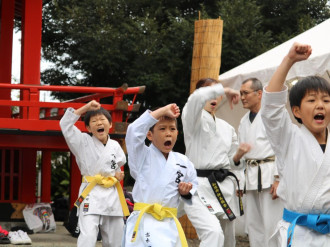 一宮町の玉前神社(一宮)で1月11日、一宮空手道教室と剛柔流有心会による空手道合同鏡開きが行われた。