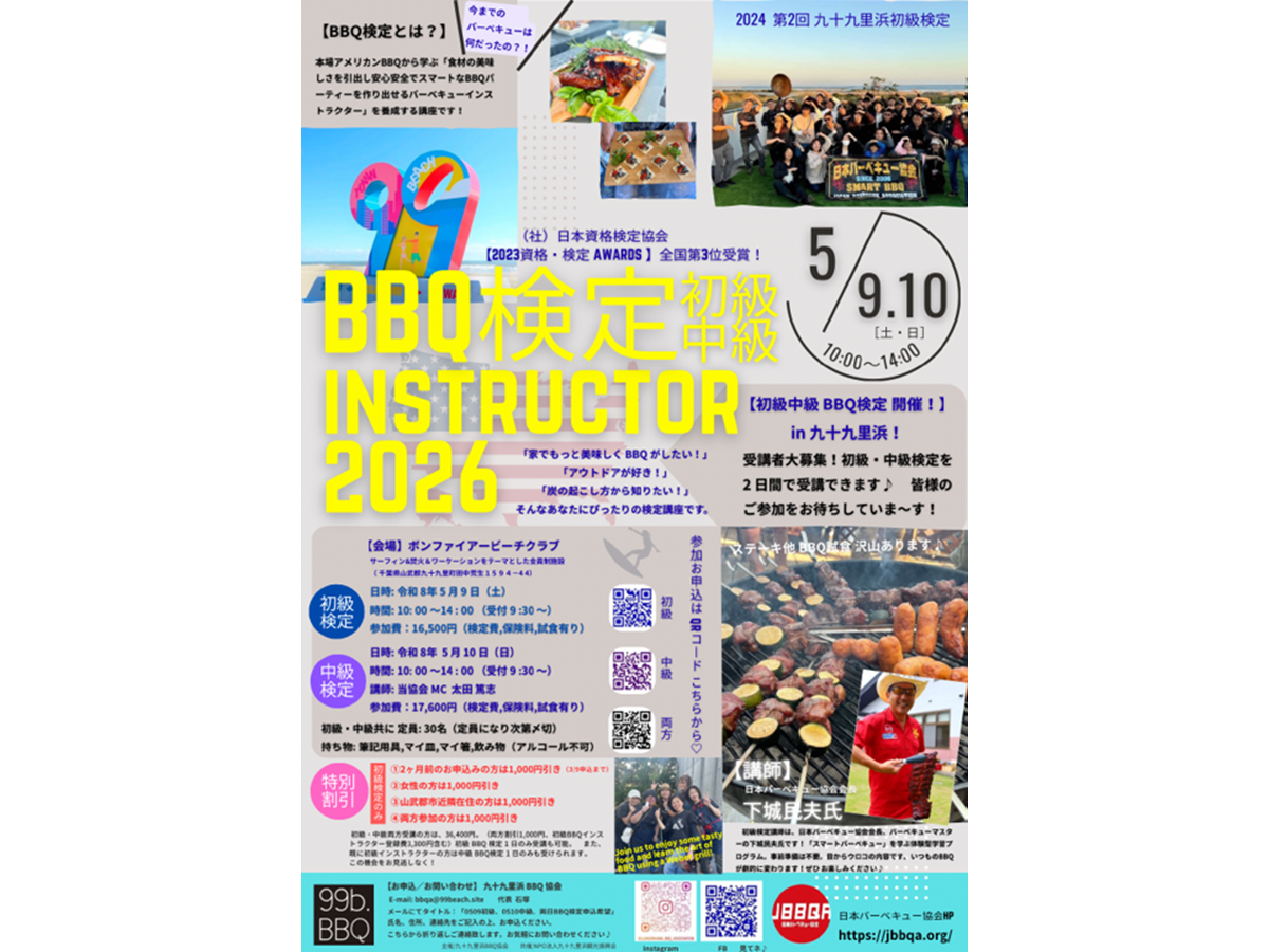九十九里浜バーベキュー協会(九十九里町田中荒生)が5月9日・10日、「初級・中級バーベキューインストラクター検定」を開催する。