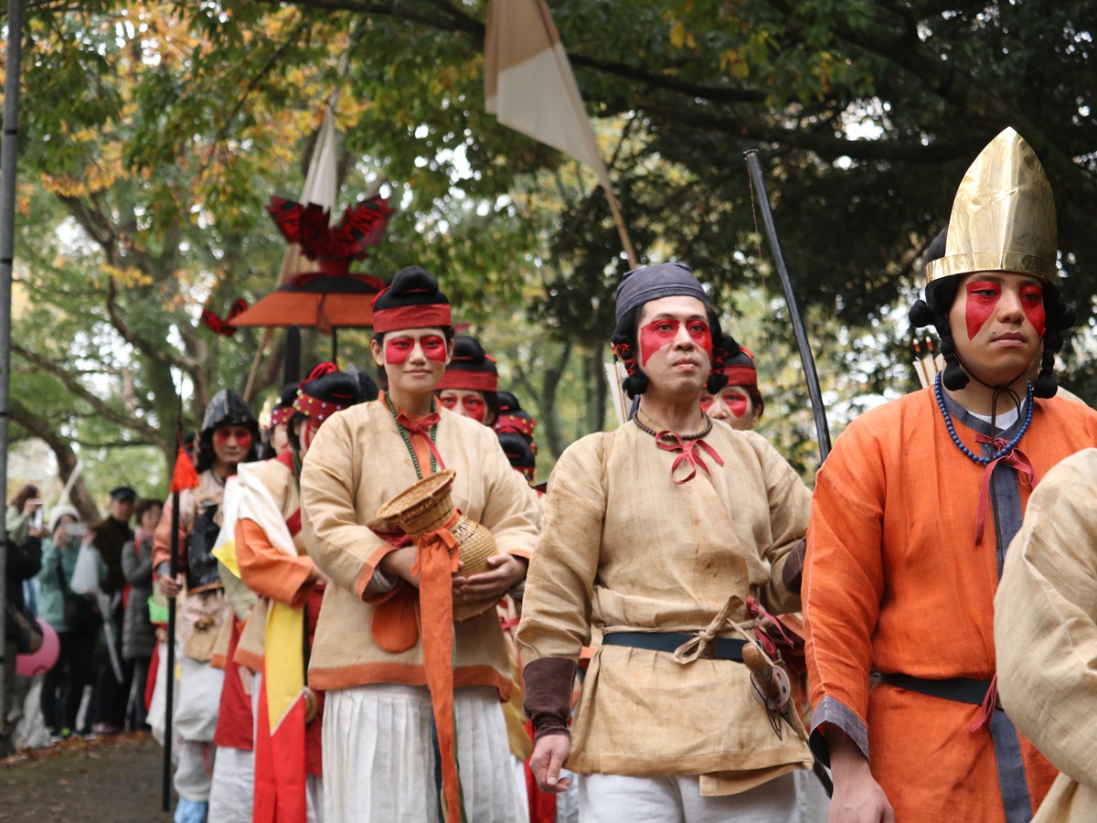 まつりは「降臨の儀」で始まり、きらびやかな衣装をまとった国造(くにのみやつこ)を筆頭に、巫女(みこ)の舞やおはやしが古代の雰囲気を演出。その後、芝山仁王尊三重塔前は「交歓の儀」として「歓迎法要」などが執り行われ、「行列の儀」で古代人一族が芝山公園まで行列して移動。
