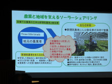 講演では、同市のソーラーシェアリングの取り組み状況や、農業と地域を支えること、新規就農者が取り組んでいる事例などを紹介。椿さんは「活動を続けていくことで、豊かで持続可能な地域になることにつながっていくのでは。住民が中心となり、官民がフラットに意見を交わせる匝瑳市を目指したい」と話す。