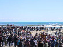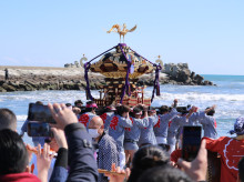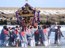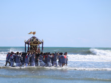 当日午前、松崎神社で出社祭を終えた一行は匝瑳市の野手浜海岸へと場所を移し、みこしが海岸に出て潮水を浴びる「お浜降り」に臨んだ。海岸では威勢のよい太鼓やしの笛が演奏される中、法被姿の担ぎ手たちが海に入ってみこしを揺らし、集まった人たちは五穀豊穣や無病息災を願いながら60年に1度の祭りを見守った。