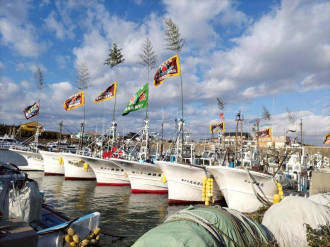旭市の飯岡漁港(旭市下永井)で1月2日、毎年恒例の「乗り初め式」が執り行われ、同港を停泊港とする漁船が海上で祈願した。