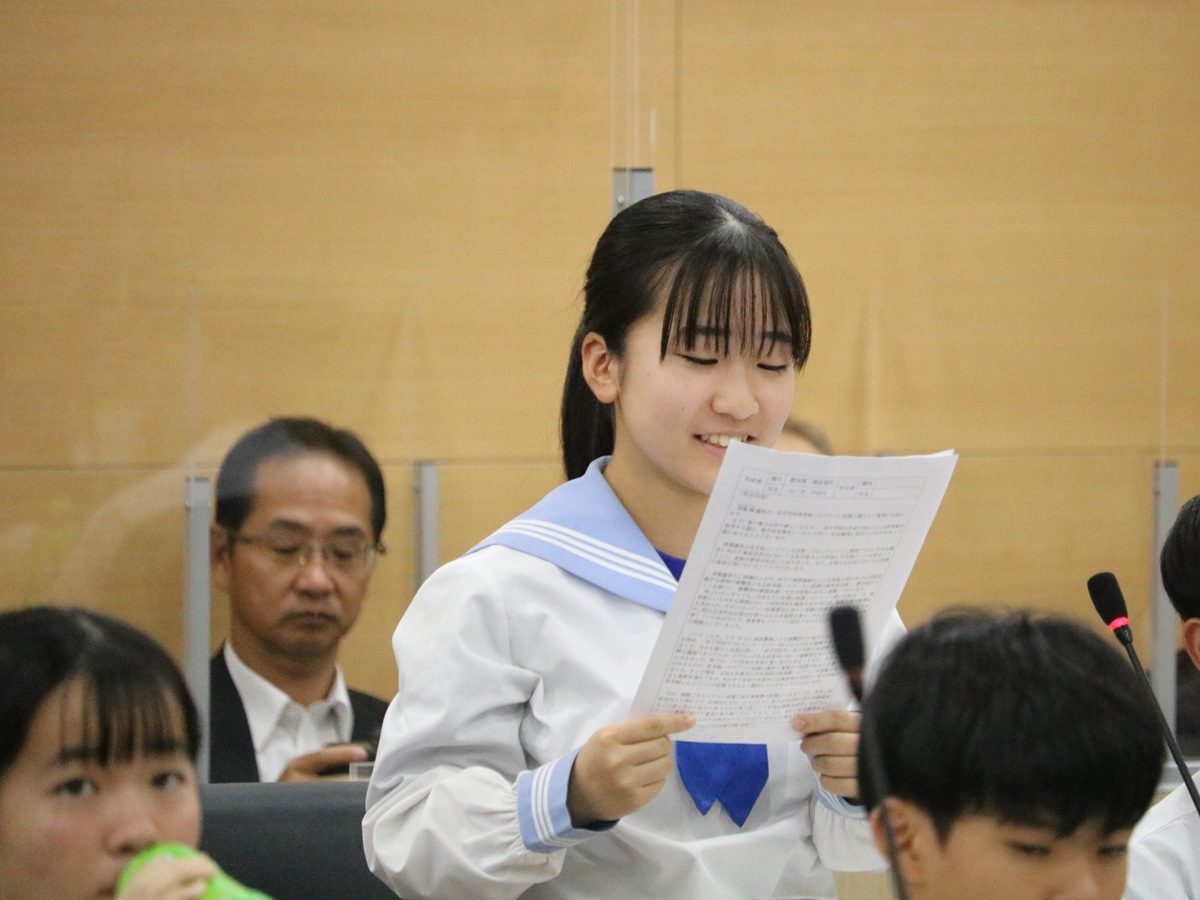 一宮町議会議場(一宮町一宮)で10月7日、「令和7年度一宮町中学生議会」が開催され、一宮中学校3年生13人が議員として町政について質問した。