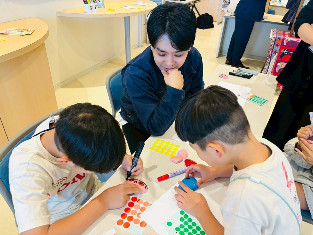 地元の海で取れたハマグリの貝殻に顔や絵などを思い思いに描いていく