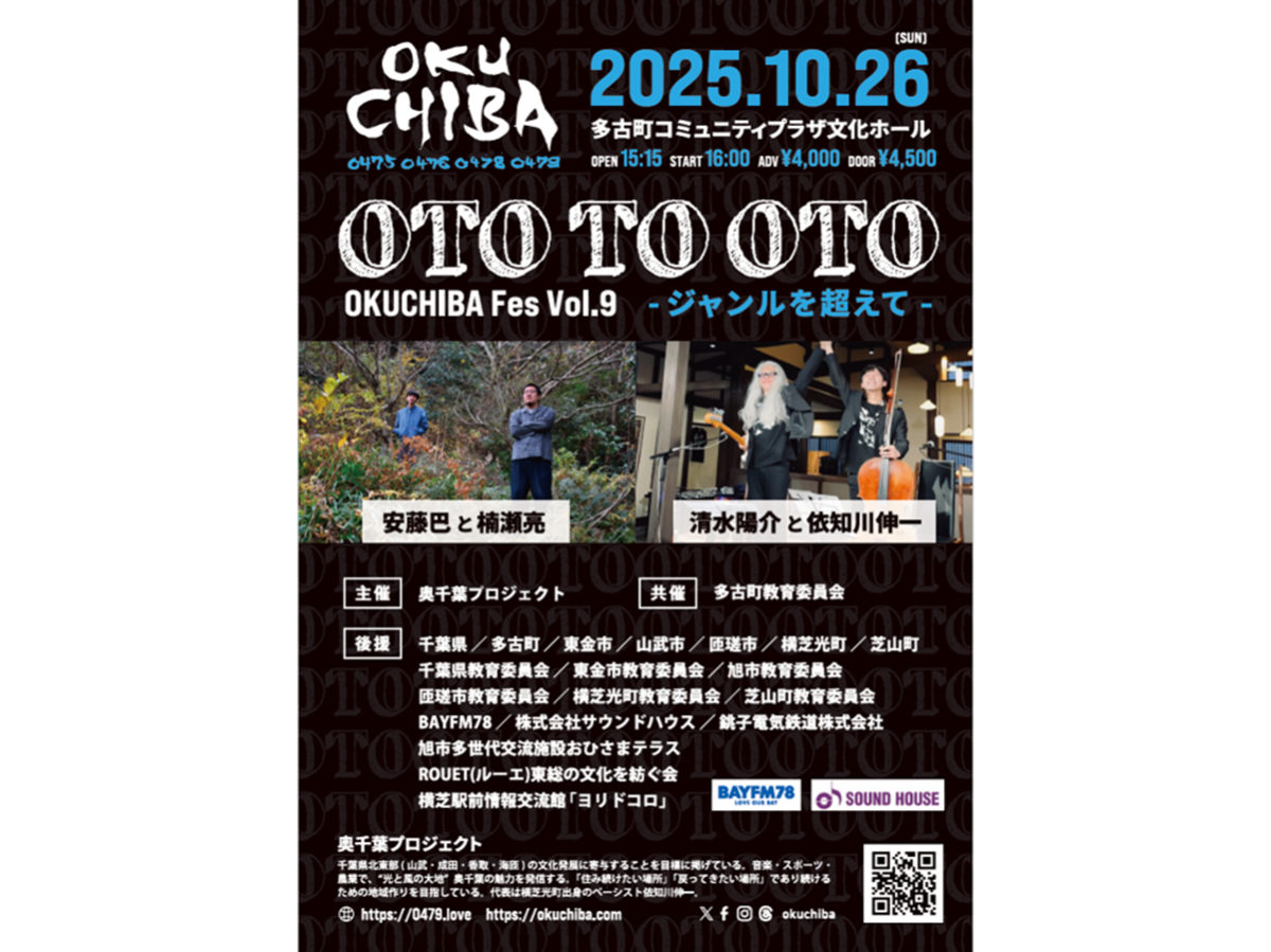 千葉県北東部の文化発展を目指す「奥千葉プロジェクト」(匝瑳市八日市場)が主催する音楽祭「OKUCHIBA Fes. Vol.9 OTO TO OTO ~ジャンルを超えて~」が10月26日、多古町コミュニティプラザ (多古町多古) 文化ホールで開催される。